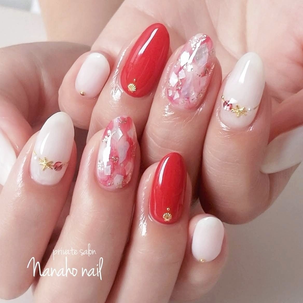 ট ইট র Raso 塗りかけネイル シェルを使って夏らしく 赤の塗りかけで可愛く仕上げました 艸 Nail ネイル Gelnail ジェルネイル Missmirage ミスミラージュ 塗りかけネイル シェルネイル 赤ネイル 可愛いネイル 個性的ネイル